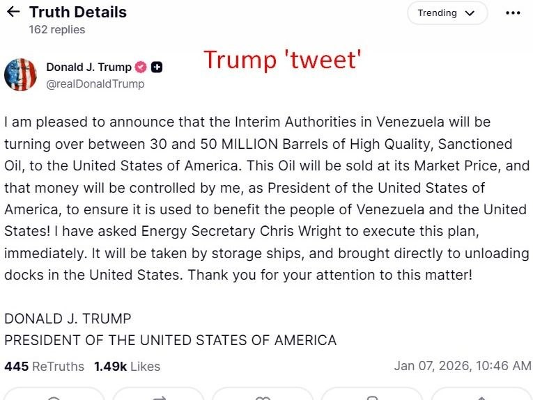 🔹ترامپ میگوید ونزوئلا ۳۰ تا ۵۰ میلیون بشکه نفت به آمریکا ارسال خواهد کرد.