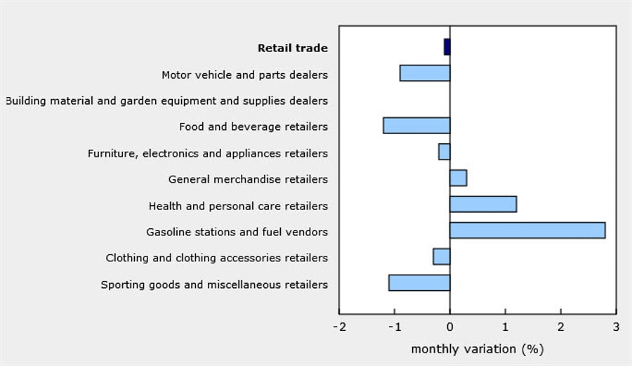 ?ارزش فروش در شش زیربخش از 9 زیربخش کاهش یافته است و منجر به کاهش در فروشندگان وسایل نقلیه موتوری و قطعات (-0.9٪) شده است. جایگاههای بنزین +2.8 درصد به دلیل قیمتهای بالاتر، افزایش داشتند.