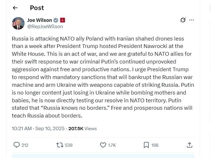 🔸عضو کنگره آمریکا: حمله روسیه به لهستان، یک اقدام جنگی است.