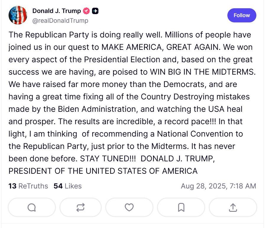 🔸نتایج باورنکردنی است، یک رکورد سرعت!!! با این اوصاف، من به فکر توصیه یک کنوانسیون ملی به حزب جمهوریخواه، درست قبل از انتخابات میاندورهای هستم.