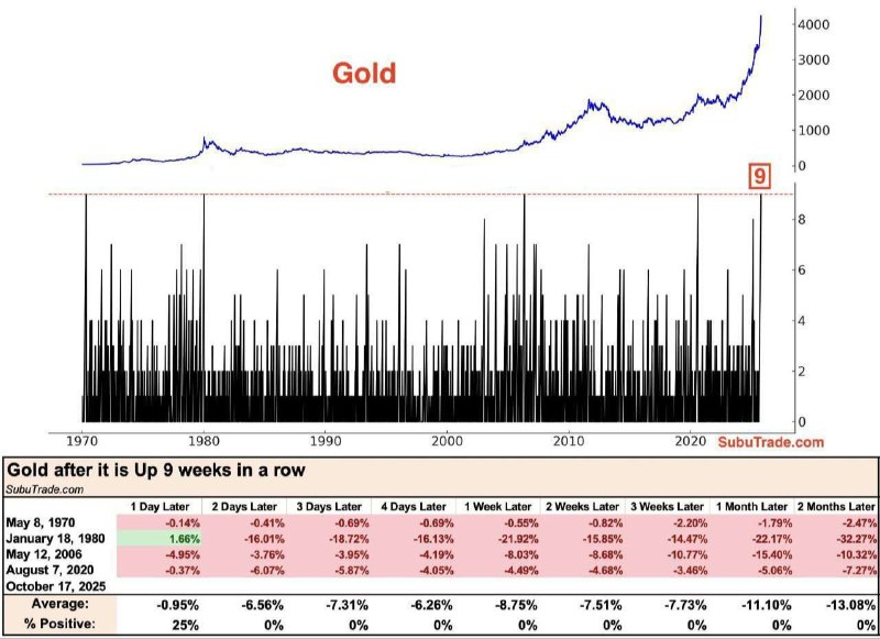 🔹جالبه بدونید طلا ۵ بار در تاریخ ۹ هفته صعودی پشت سرهم داشته اما توی هفته دهم روند نزولی شده!