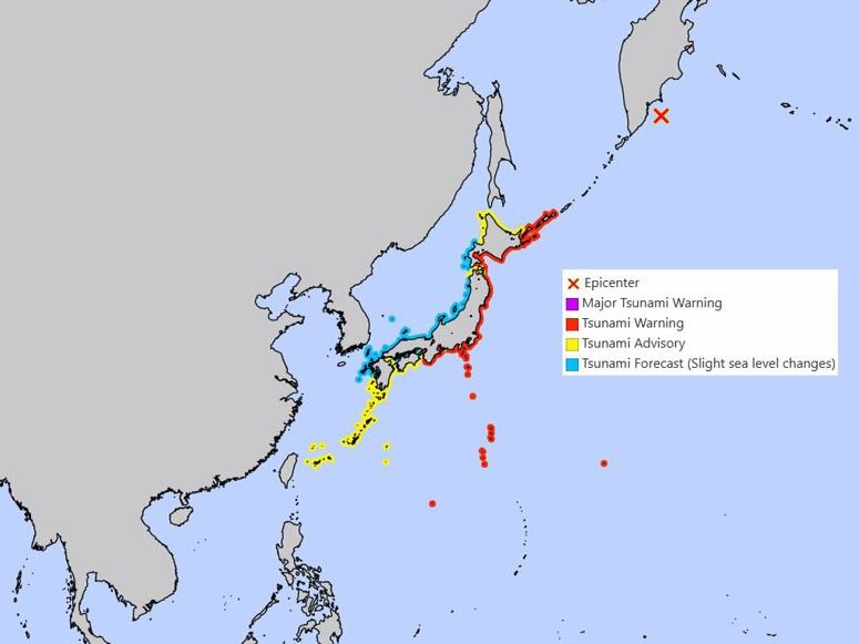 🔹این زلزله در منطقه طنینانداز شده است و ژاپن پیش از این هشدار سونامی برای خط ساحلی اقیانوس آرام صادر کرده و گفته است که امواج میتوانند تا ارتفاع ۳.۳ فوت برسند.