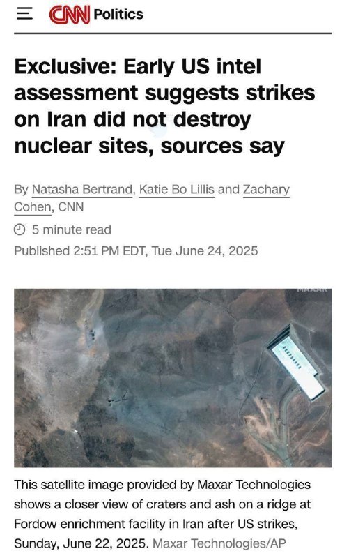 🔹بر اساس ارزیابی اولیه آژانس اطلاعات دفاعی آمریکا (DIA)، حملات نظامی اخیر آمریکا به سه مرکز هستهای ایران، بخشهای کلیدی برنامه هستهای جمهوری اسلامی را نابود نکرده و تنها ممکن است آن را چند ماه به تأخیر انداخته باشد. به گفته یکی از منابع مطلع، ارزیابی این است که آمریکا در بهترین حالت برنامه هستهای ایران را فقط چند ماه به عقب انداخته است.